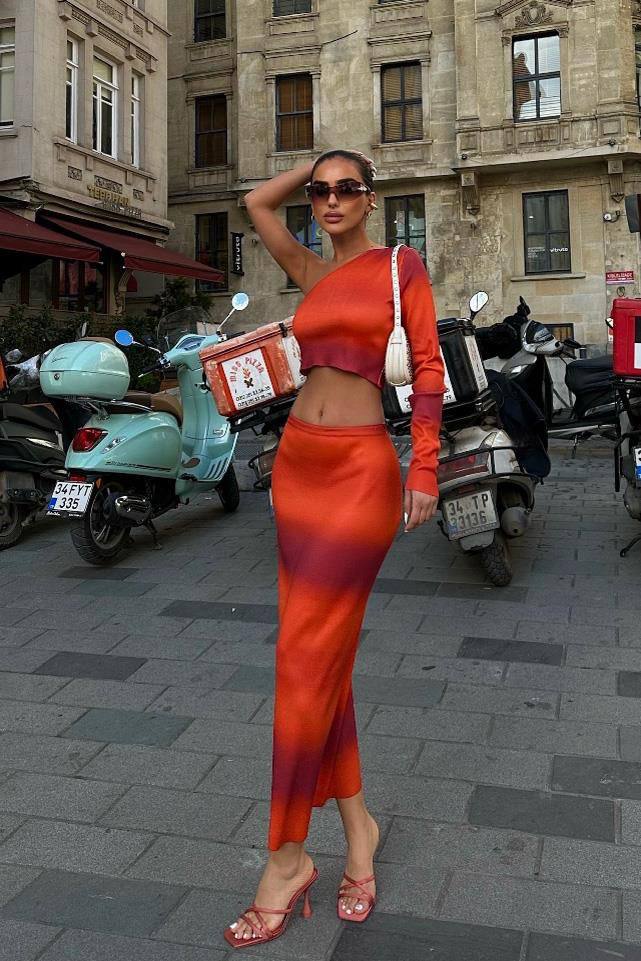 This is a stunning sunset-inspired two-piece set featuring a bold orange gradient. The top is an asymmetrical one-shoulder crop top with a single long sleeve, offering a modern and daring look. It is paired with a matching high-waisted maxi skirt that hugs the silhouette, creating a sleek, elongated aesthetic perfect for a summer evening.