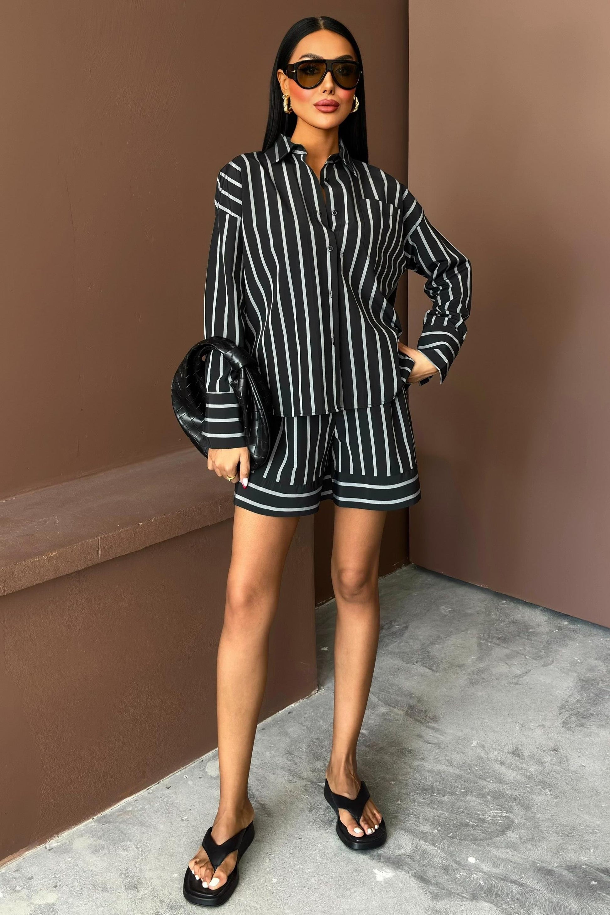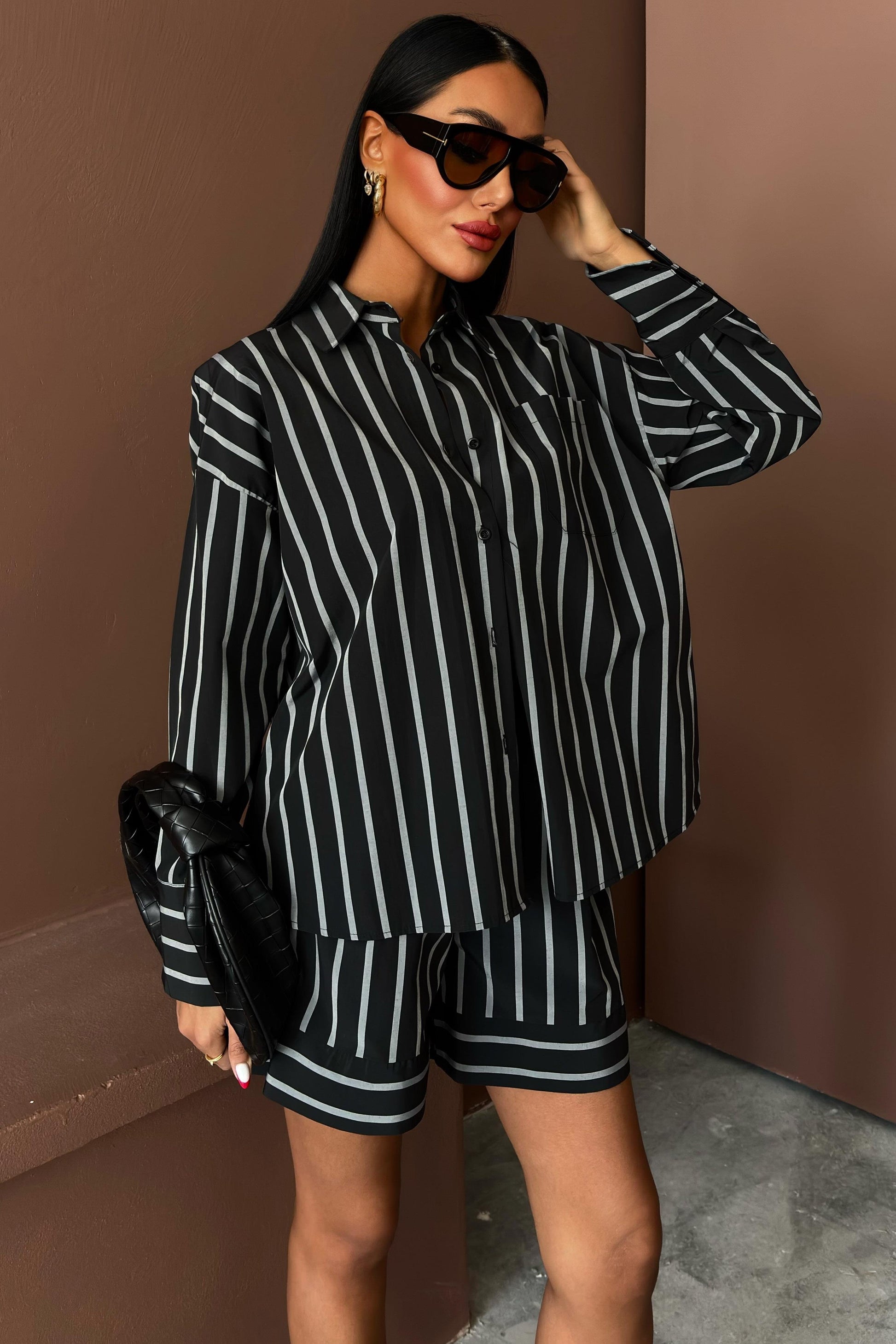 Chic, relaxed, and effortlessly put-together — the Piera Striped Shorts Set features a long-sleeve button-up shirt with a classic collar and matching high-waisted shorts. The sleek vertical stripe pattern adds a sophisticated edge to this casual set, perfect for day outings or elevated lounging.