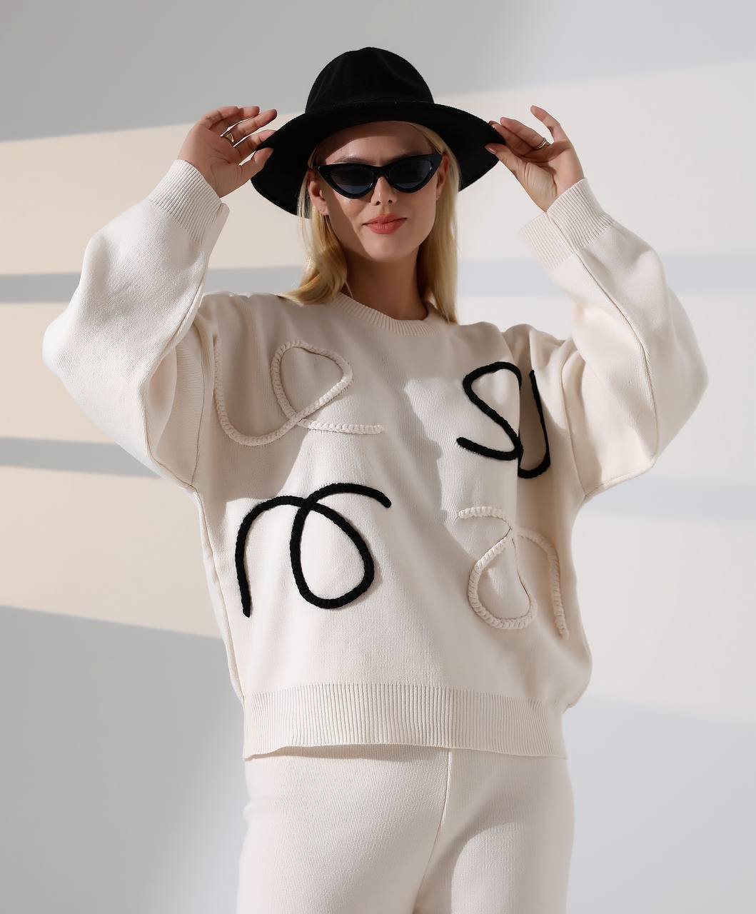 Two-piece knit set in soft and comfortable fabric. Includes a long-sleeve sweater with abstract embossed design and straight mid-rise pants. Available in beige and white. One size.